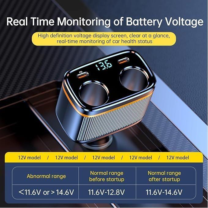 The charger is compatible with 12-24V inputs, making it suitable for a wide range of vehicles, including cars, SUVs, trucks, and RVs. Its flexible rotatable design with an adjustable gimbal shaft makes it easy to position in tight or angled cigarette lighter ports. The built-in LED digital voltmeter provides real-time monitoring of car battery voltage, enhancing safety and convenience for users.
