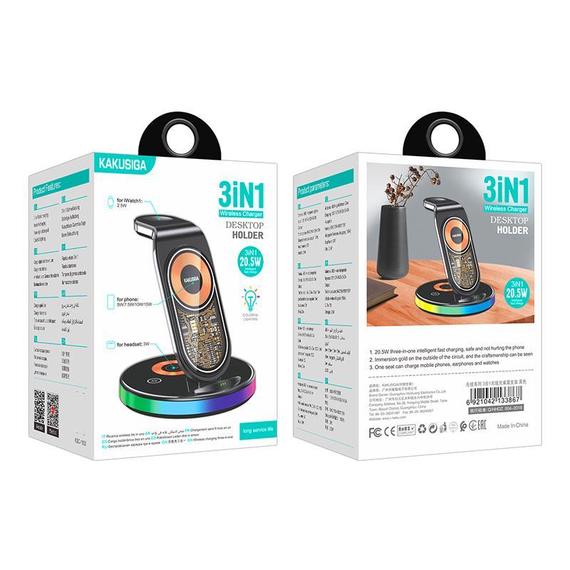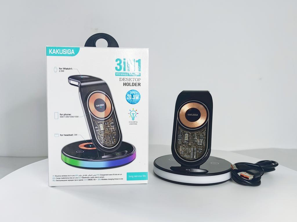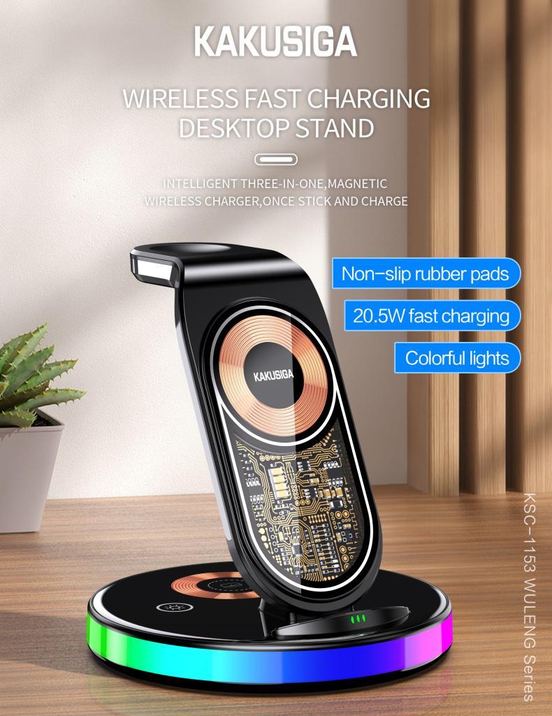 The KAKUSIGA KSC-1153 is a stylish and futuristic three-in-one magnetic wireless fast charger designed to charge a phone, smartwatch, and wireless earbuds simultaneously. With its glowing LED ring, magnetic alignment, and vertical stand design, it’s both a charger and a desk accessory.