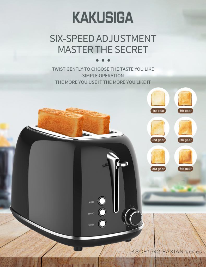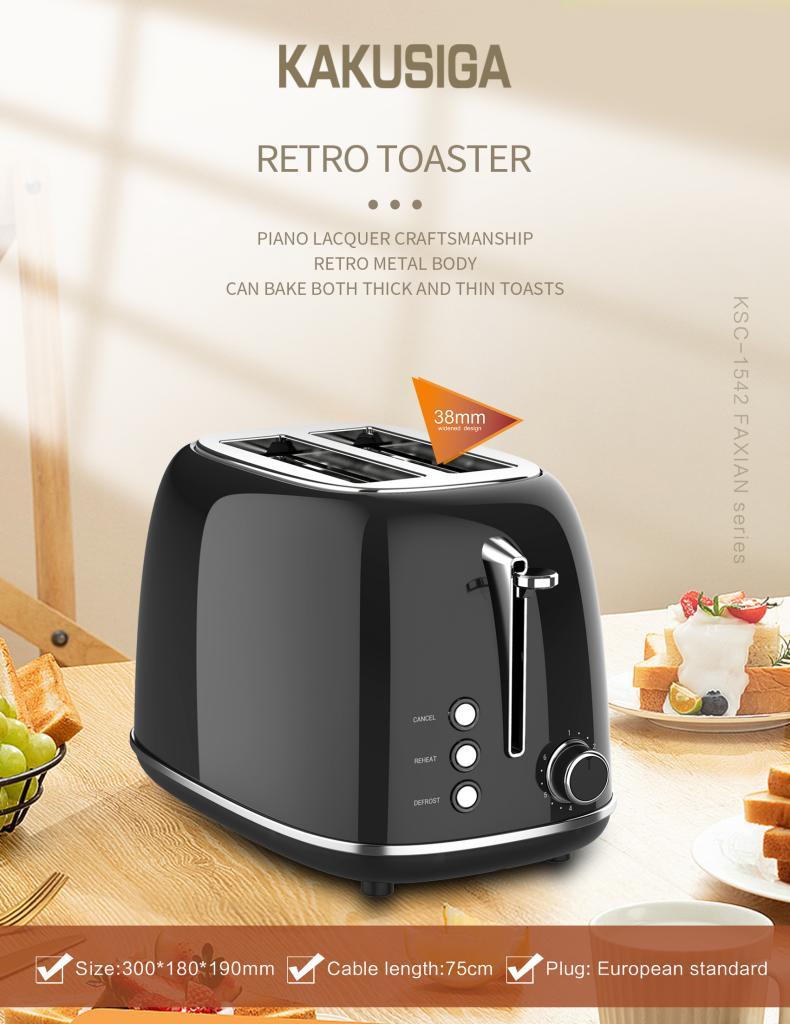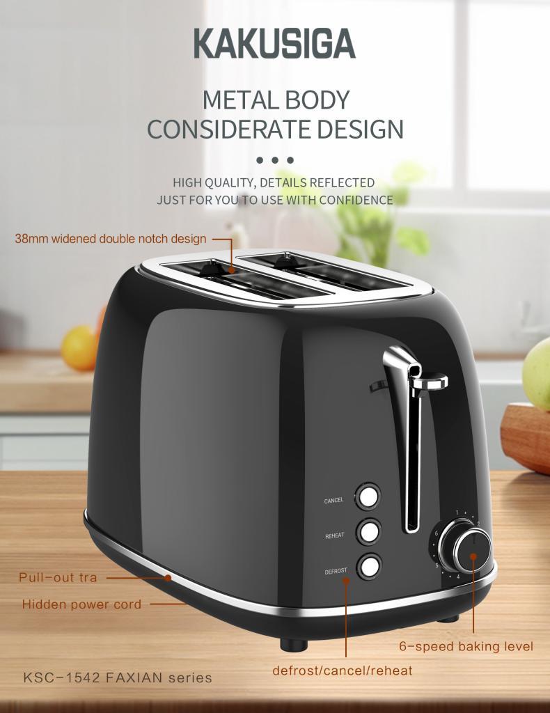 The KAKUSIGA Retro Toaster combines vintage elegance with modern convenience. Its piano lacquer finish, retro metal body, and user-friendly design make it the perfect addition to any kitchen. Whether you're toasting thin slices or thick artisanal bread, its 38mm extra-wide slots handle it all with ease. Bring charm and performance to your countertop with the KAKUSIGA Retro Toaster. Perfect for daily use or gifting. With 6 browning levels, you can enjoy your toast just the way you like it—lightly golden or perfectly crispy. Featuring Cancel, Reheat, and Defrost functions, it adapts to your needs and delivers consistent results every time.