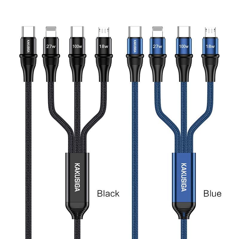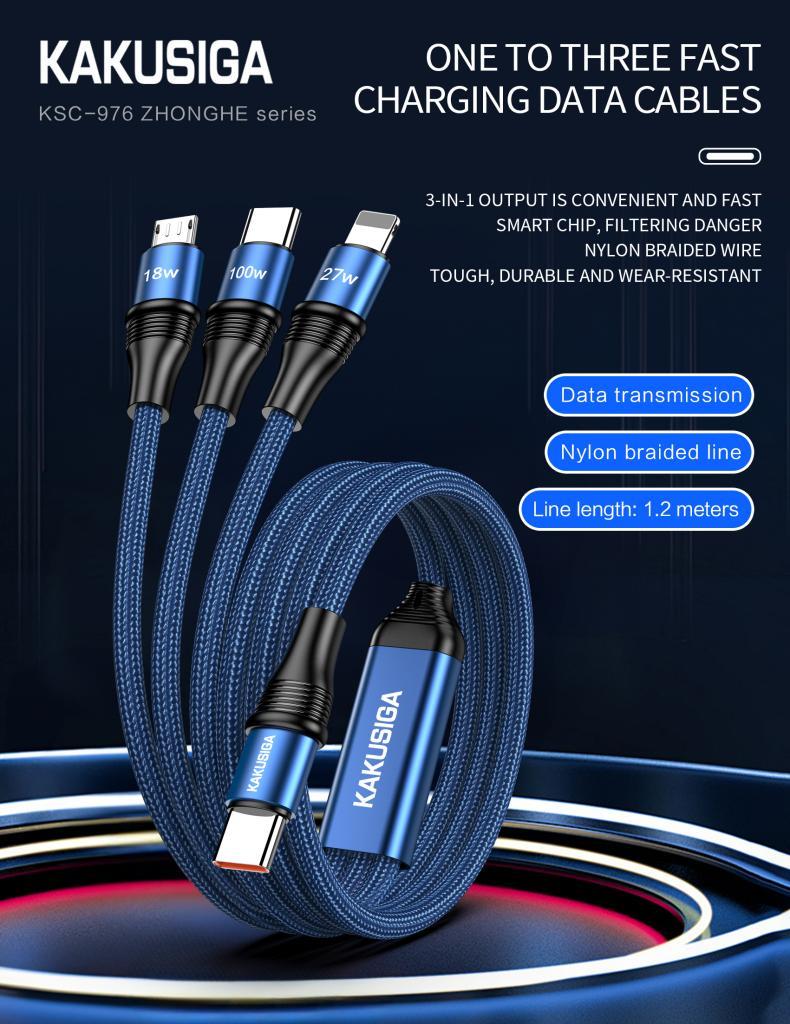 The KAKUSIGA KSC-976 ZHONGHE Series 3-in-1 Fast Charging Data Cable is a premium, multi-functional cable designed to meet all your fast charging and data transmission needs. With super-fast PD100W charging, this cable supports a variety of devices, providing a seamless charging experience. Whether you're charging your phone, tablet, or laptop, this cable does it all.