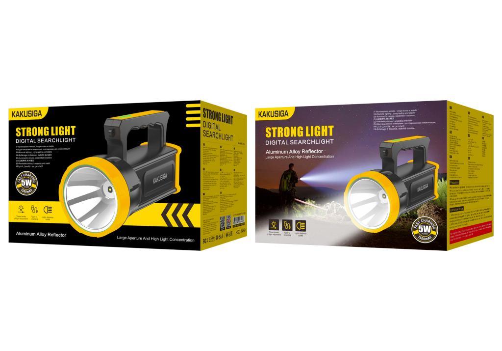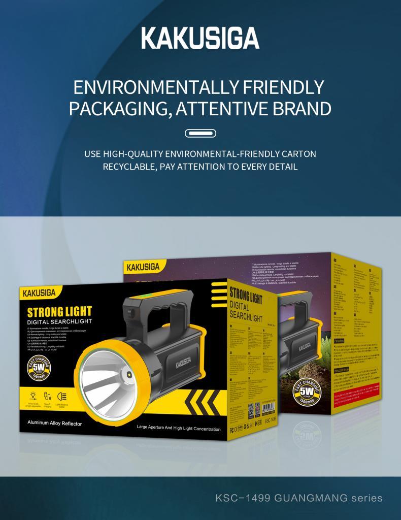 The KAKUSIGA KSC-1499 GUANGMANG Series is a high-performance digital rechargeable searchlight built for maximum brightness, durability, and convenience. Designed with a 95mm optical glass lens and 98mm aluminum reflector cup, this searchlight delivers a powerful 5W beam with a range of up to 500 meters. Whether you're outdoors, on patrol, camping, or preparing for a blackout, this rugged torch provides reliable illumination with three lighting modes and an easy-to-use dual switch system. The built-in 1500mAh rechargeable battery charges quickly via USB Type-C, ensuring you're always ready.
