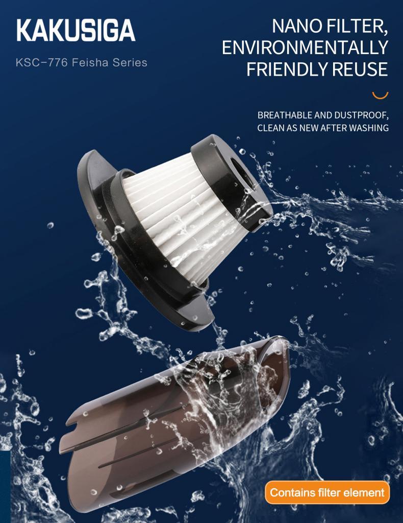 3-Layer Filter System Unlike other hand vacuum, this hand held vacuum uses stainless steel filter+ nonwoven filter+ sponge filter, more effectively filter debris and protect the high-speed motor to extend its service life. All 3 filters are washable and reusable, deeply clean them with
