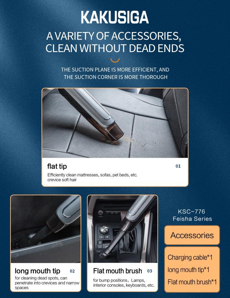 Thorough Cleaning: This portable vacuum cleaner is versatile and comes with multiple attachments, the wide nozzle easily cleans flat surfaces, the long nozzle can clean narrow corners without missing any small corners, and the flowing brush head can clean various uneven surfaces.